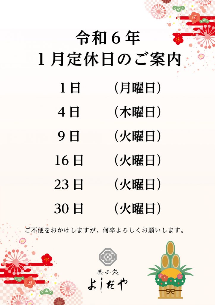 日頃より、菓子処よしだやをご愛顧いただき誠にありがとうございます。 菓子処よしだやの令和6年1月定休日のご案内を申し上げます。 皆様には大変ご迷惑をおかけいたしますが、ご了承いただきますようお願い申し上げます。